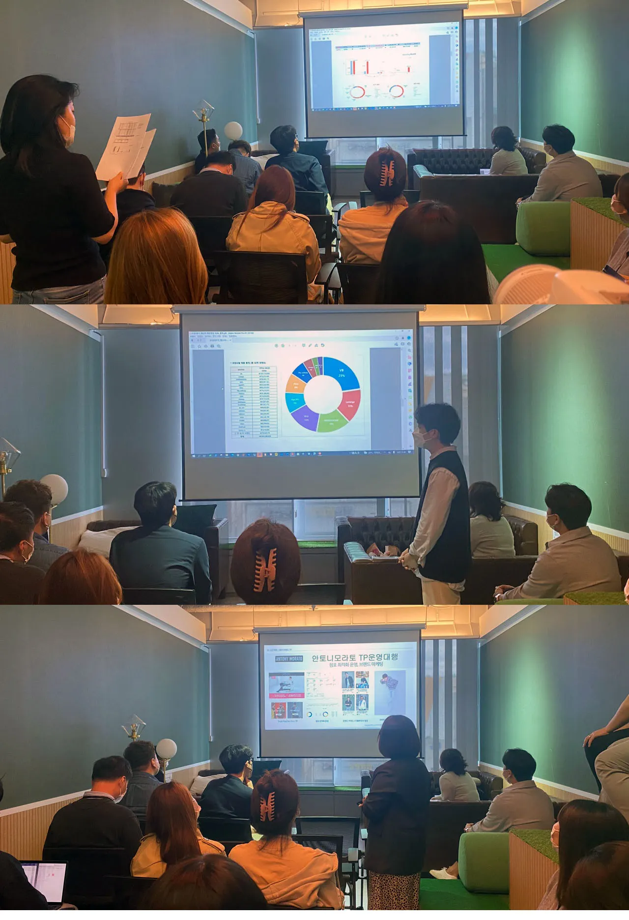 한 눈에 쏙 들어오는 그래프 및 사진 자료를 이용하여 팀별 실적 및 현황에 대해 발표해 주셨습니다!