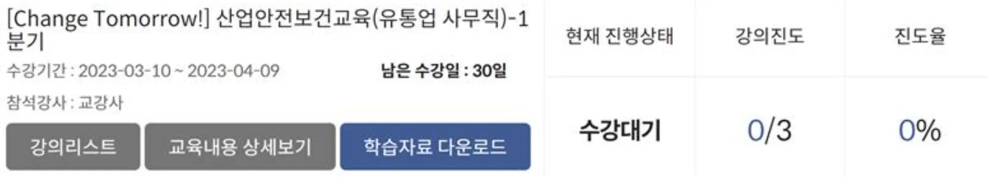 교육은 산업안전보건교육(1분기)이며, 강의 개수는 총 3개, 이후 최종평가 진행하여 주시면 됩니다.