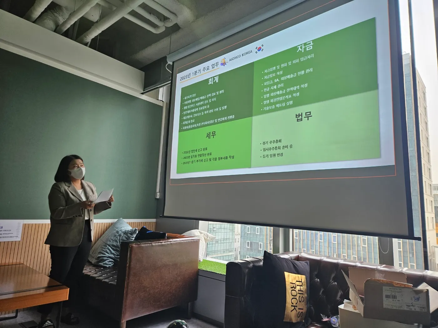 본격적으로, 첫번째 분기보고는 영업본부 해외영업팀의 강지은팀장님, 심슬기팀장님, 물류팀의 최준영팀장님이 진행해주셨습니다.
